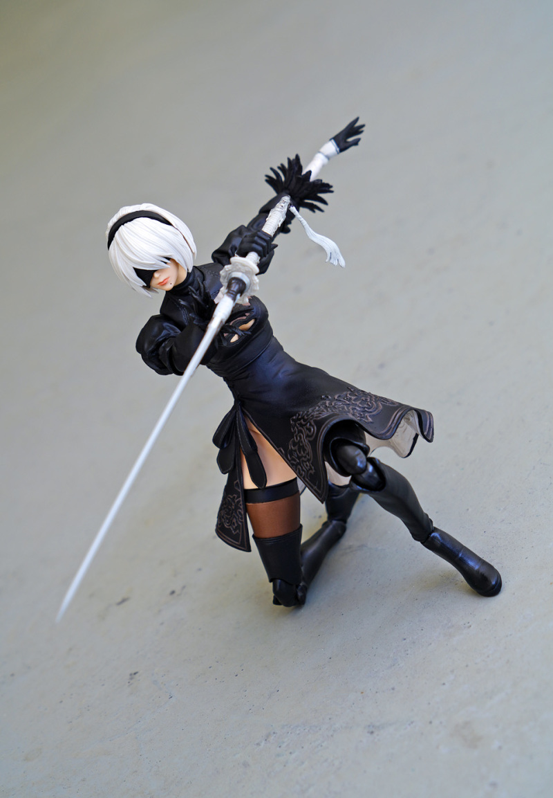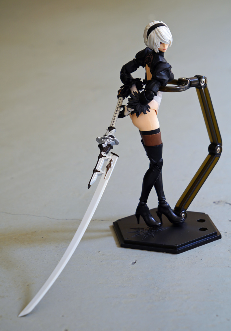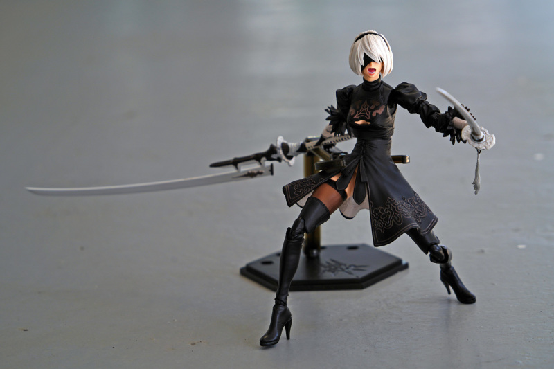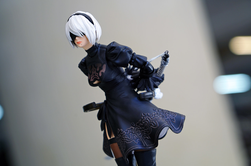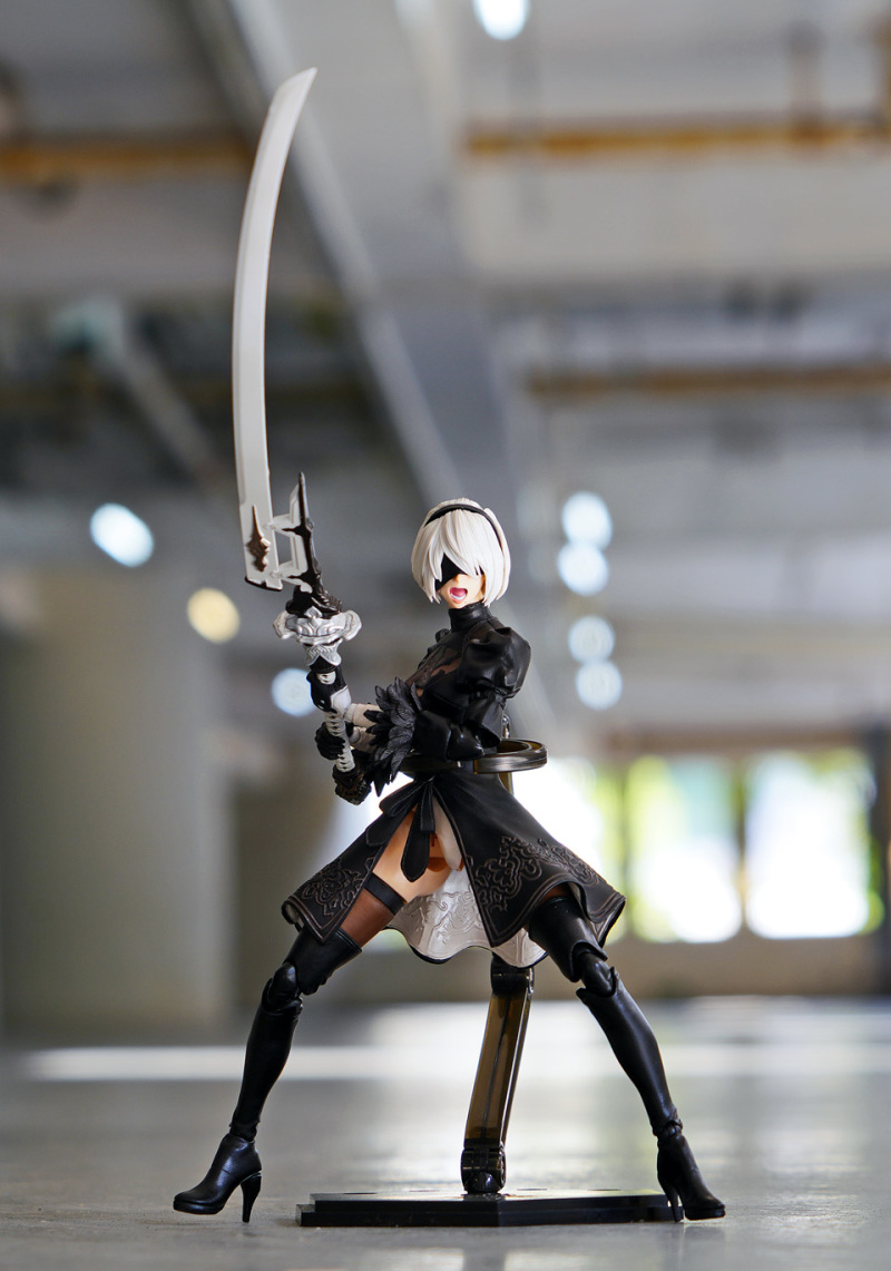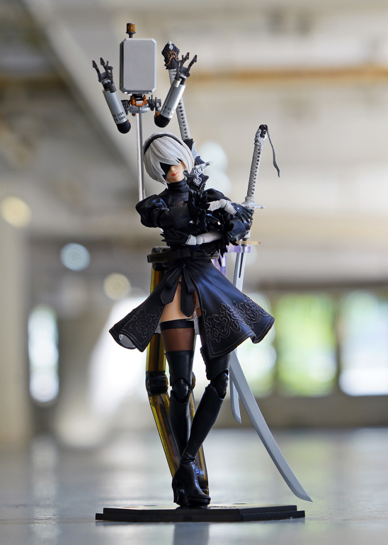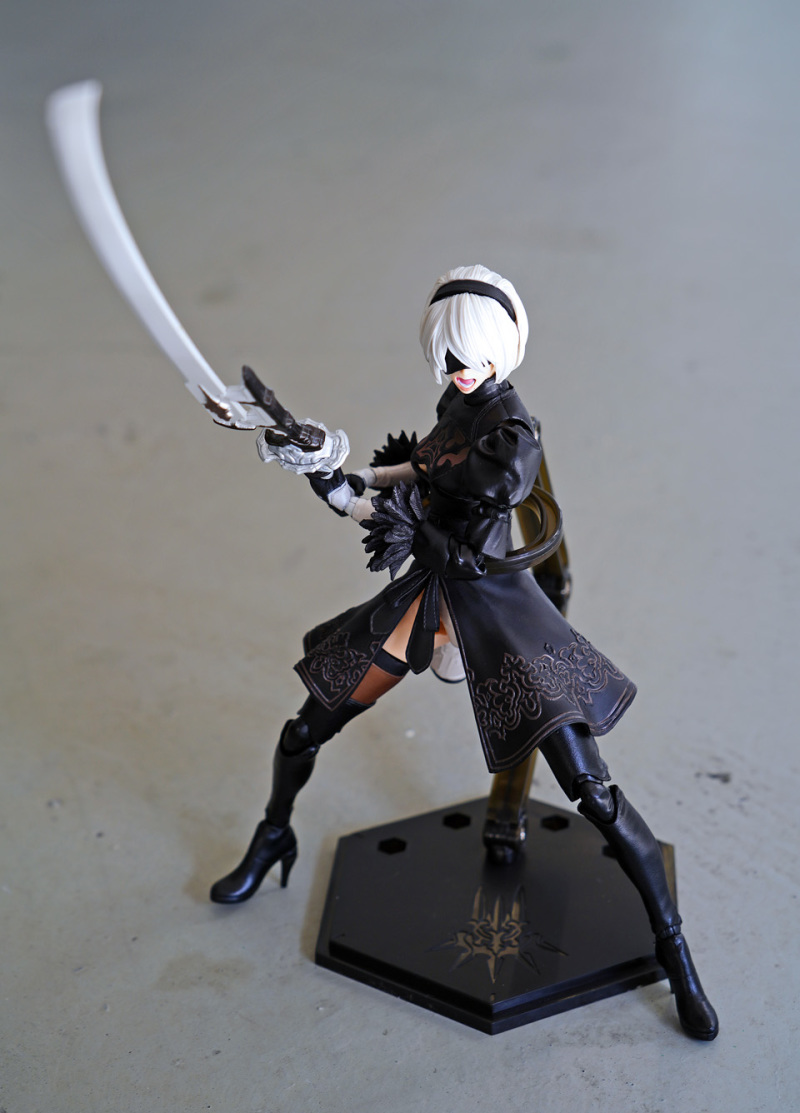 比例約一比八。主體可動關節不少,可動性不俗。另按照原版造型配上了全套 Lolita 戰衣,並以黑色為主調。配件除了 POD 之外,並附上兩把遊戲中的主力兵器:武士刀及聖劍!另外最重要當然是自爆裝置的白色內衣下盤素體...... 面相方面包括了除下眼罩版本及咆哮臉相。遺憾的是如果不使用台座,其高跟鞋造型令她很難自然站立...... 還好,台座的設計不錯。