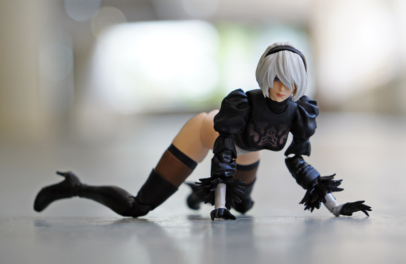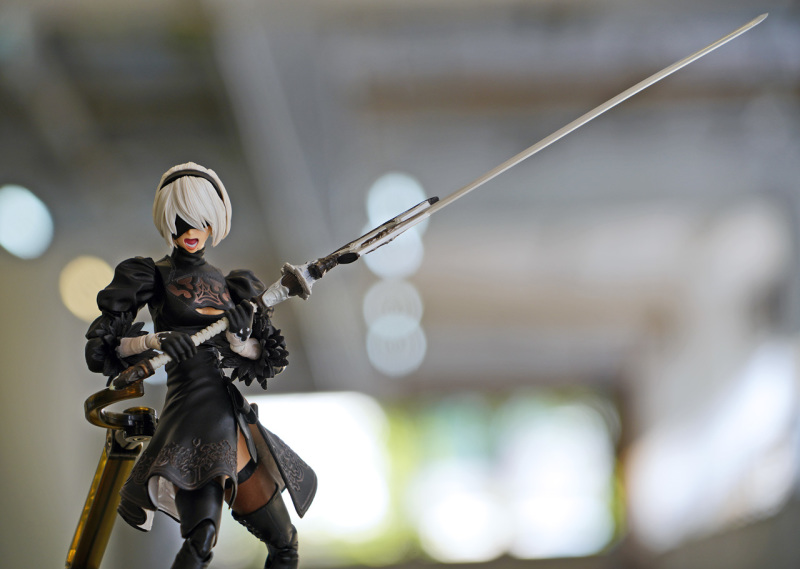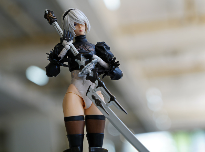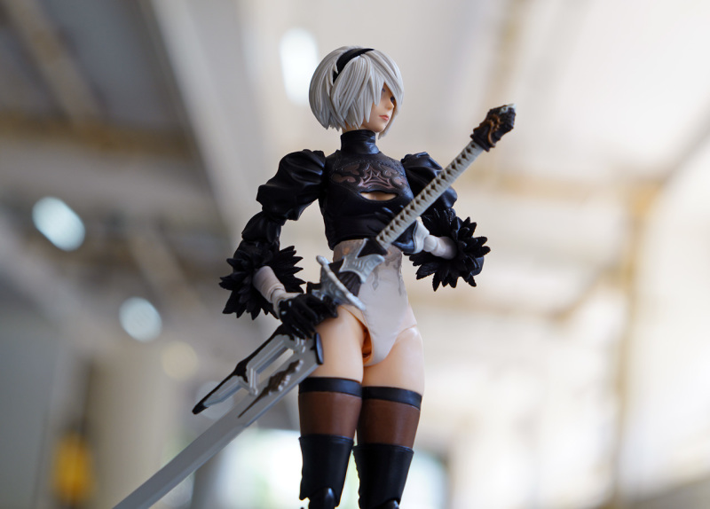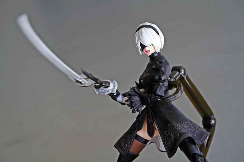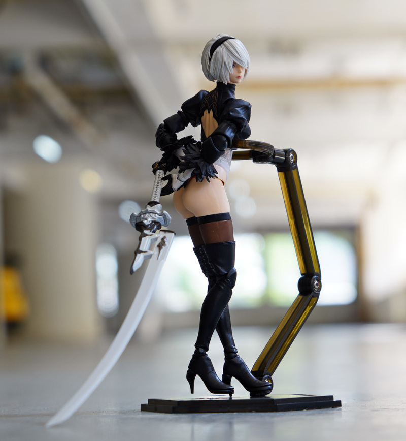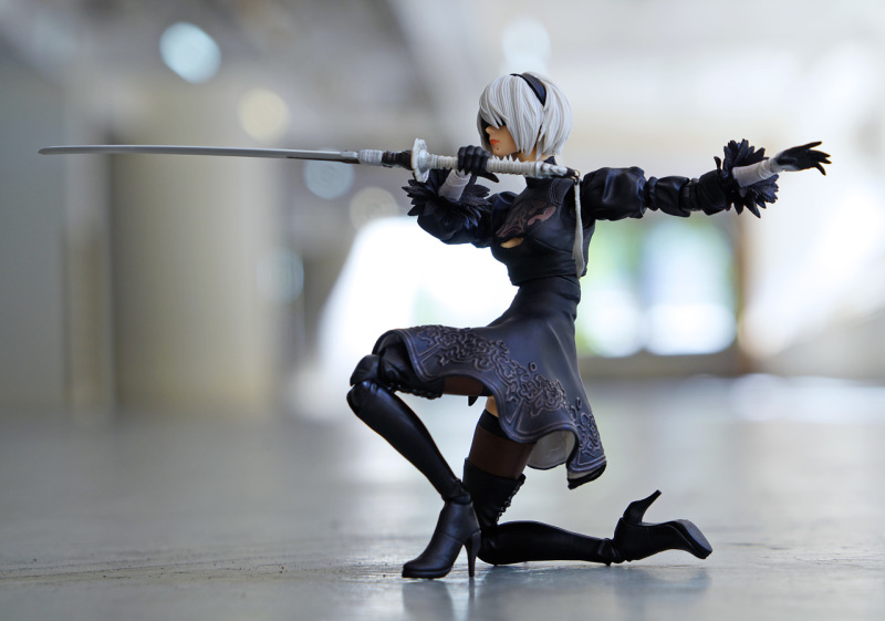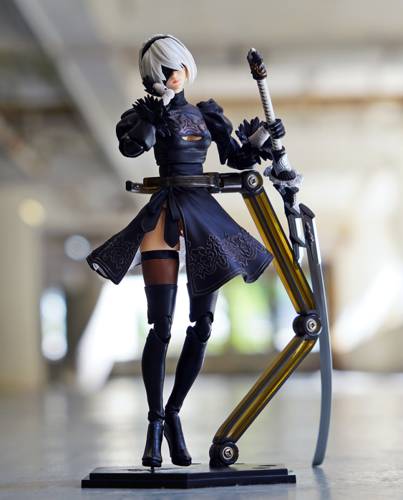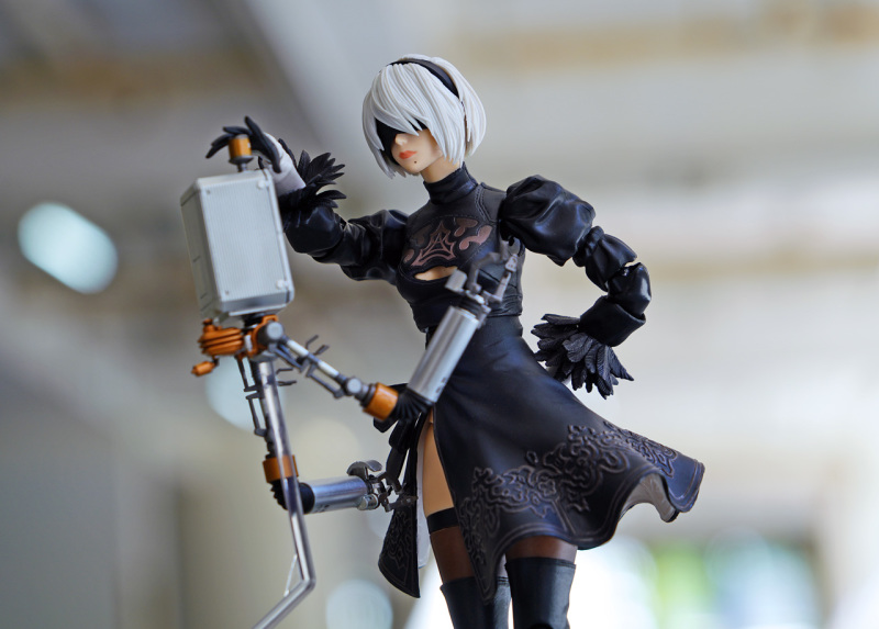 比例約一比八。主體可動關節不少,可動性不俗。另按照原版造型配上了全套 Lolita 戰衣,並以黑色為主調。配件除了 POD 之外,並附上兩把遊戲中的主力兵器:武士刀及聖劍!另外最重要當然是自爆裝置的白色內衣下盤素體...... 面相方面包括了除下眼罩版本及咆哮臉相。遺憾的是如果不使用台座,其高跟鞋造型令她很難自然站立...... 還好,台座的設計不錯。