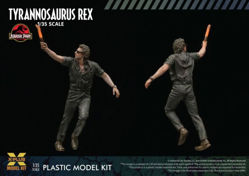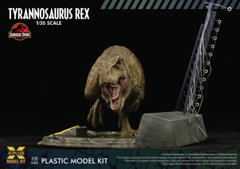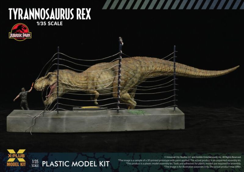 而為了表現出霸王龍正在衝刺、處於單腳站立的瞬間,X-PLUS 選擇採用塑膠模型而不是 PVC 或樹脂將其立體化,本次霸王龍的未上色組裝模型套件呈現出土黃色的成型色,組裝完成之後長約 38 公分,除了表現出粗糙的皮膚紋理與厚實的肌肉線條之外,也可以看到嘴巴的牙齒、舌頭採用大量分件;此外,還有電網與道路場景跟正在吸引霸王龍注意的「伊恩·馬康姆」可以搭配,運用塗裝技巧與想像力,重現這經典的追逐場景吧!
