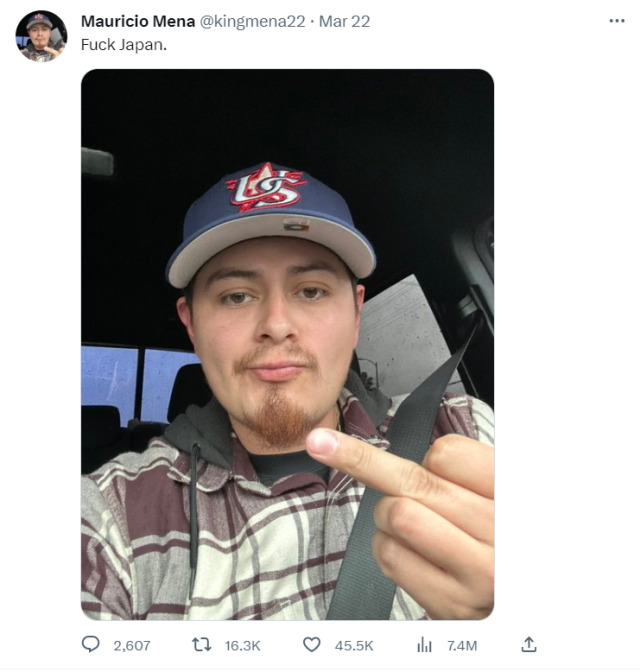 昨天 ( 3/22 ) 最大的新聞,就是 WBC 世界棒球經典賽由日本對上美國,日本獲得冠軍的消息,幾乎是日本舉國狂歡。不過相較於美國球迷來說,可真的是煎熬的一天,輸球鐵定難受,有一位住在洛杉磯的美國球迷就在推特發布「怒比中指」的照片,並打上「Fuck Japan」 卻引來一堆日本網友前來留言,成為網路話題之一。
