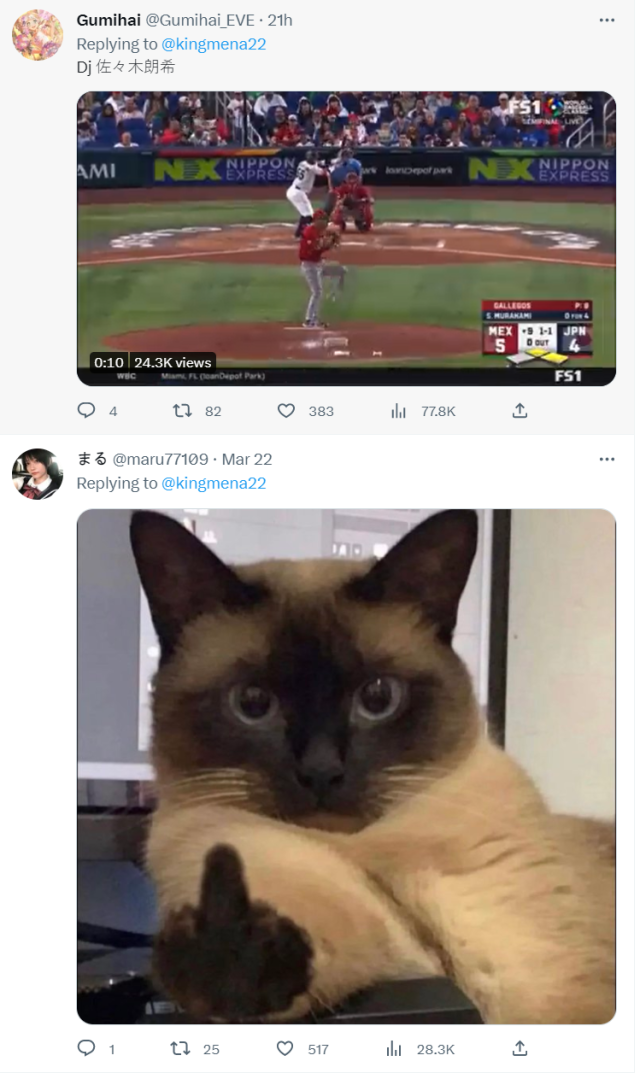雖說這位美國球迷用國罵與中指問候,不過日本網民的回應方式也讓人看到日本的嘲諷文化,不罵回去反而作一堆超意味不明的梗圖跟GIF,也算是一絕了吧 XD。也看到現在推特上就算你只是一個沒名氣的路人,還是有機會因為這種方式...被大家關注的 ( ? )
