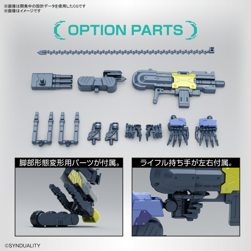 駕駛艙與背部的靈柩皆有展開機構,能夠放入主角 KANATA 與他的 MAGUS 夥伴諾瓦爾的迷你人偶。武裝零件則附有步槍、煙霧彈發射器、鋸鏈發射器等,可藉由替換零件方式再現鋸鏈的發射狀態。此外配件中也附上多種貼紙能夠再現機身標誌、眼型感測器的多種表情演出。