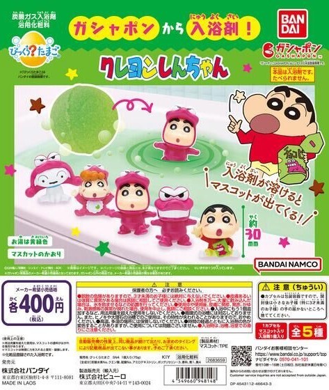 日本萬代玩具公司轉蛋事業部「GASHAPON」旗下將轉蛋與泡澡球結合的全新「驚奇蛋(びっくらたまご,暫譯)」系列,將以《蠟筆小新》為主題推出第一彈「蠟筆小新 驚奇蛋」轉蛋!一共有 5 種款式,每轉參考售價為 400 日圓,於 2023 年 03 月下旬發售。