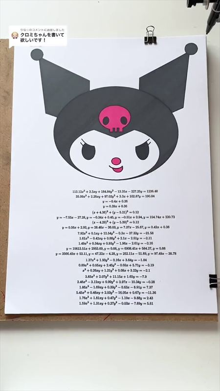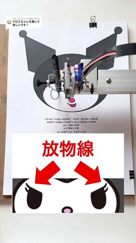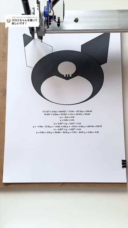 日本一位網友数式の美術館(@sushiki_kato)在Tik Tok上上傳了他利用自製的程式和數學公式,以機械臂來畫出三麗鷗人氣角色「庫洛米」的影片,影片中他讓機械臂透過程式的運作和數學公式得出的答案來一步步畫出庫洛米的樣子,甚至連如睫毛那樣的細節也能透過「拋物線公式」來畫出,而成品就是一個完美的可愛庫洛米。