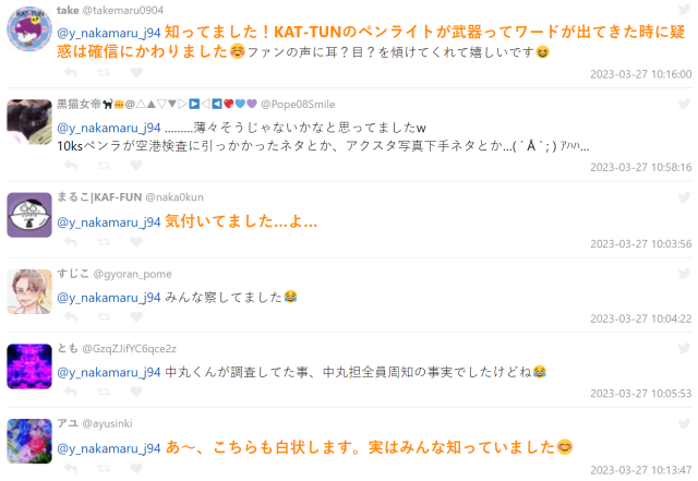 不少粉絲也留言回應,對於中丸一直都潛伏在推特裡觀察粉絲這行為感到欣慰,相信他是真的很重視粉絲的。不過粉絲也坦言,這些歌曲的詞是看得出來中丸有在做這些事情,能在歌詞中講出現實中發生的事件,粉絲也都懂他的用心。