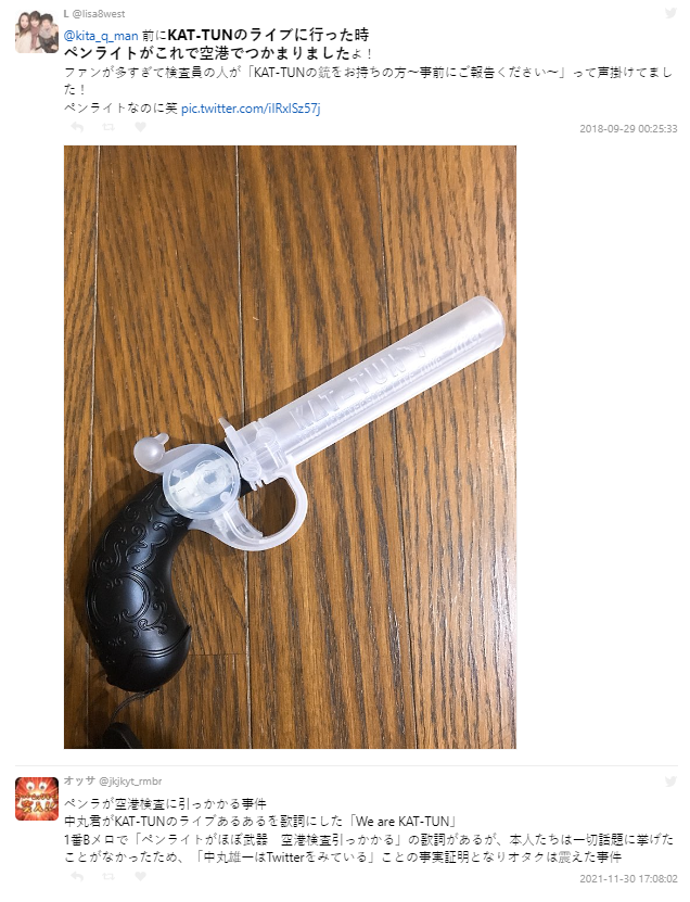 ( 「We are KAT-TUN」中歌詞 : みんなの笑顔見て ライブグッズもこだわりたくなる ペンライトがほぼ武器 空港検査ひっかかる )