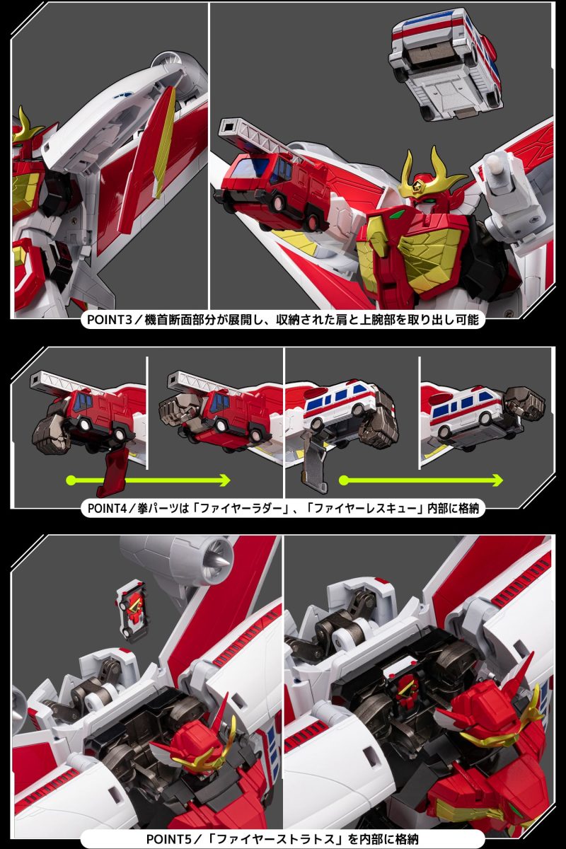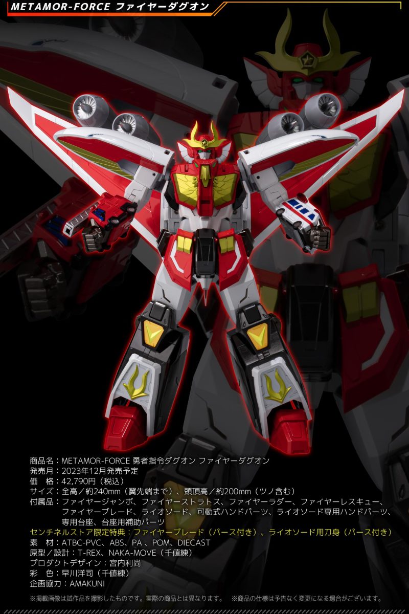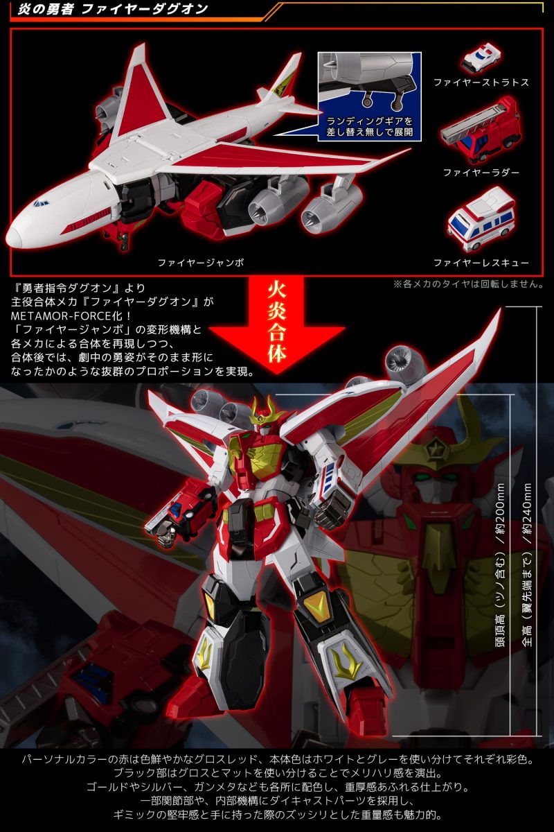 「METAMOR-FORCE 火焰達古王」商品內包含達古火焰(火焰巡邏車)、火焰雲梯車、火焰救護車、火焰巨無霸客機等四架機體,每架機體除了重現作為交通工具形態的造型與色彩外,身軀佔比 9 成的火焰巨無霸客機也具備千值練重新詮釋的完全變形機構,整個變形合體過程無需替換零件,就能再現全高約 24 公分、具備靈活可動的「火焰達古王」!