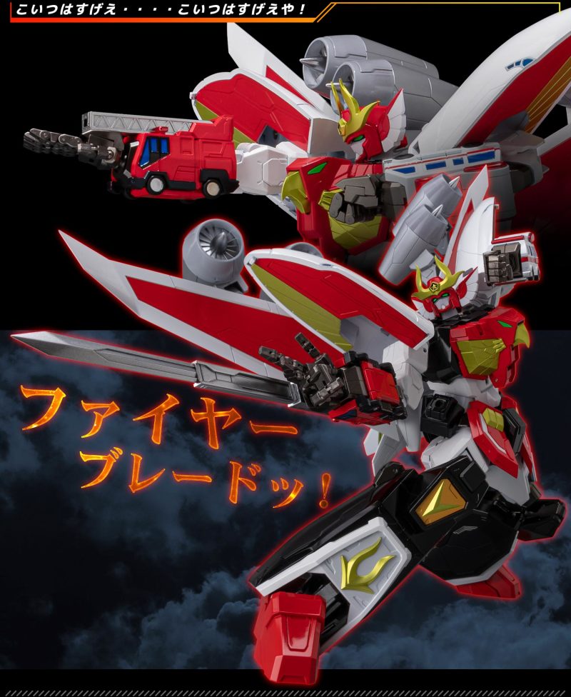 商品內容:達古火焰(火焰巡邏車)、火焰雲梯車、火焰救護車、火焰巨無霸客機、火焰劍劍身(一般)、火焰劍、狂獅劍、狂獅劍劍身(一般)、可動式手掌零件(左・右)、狂獅劍專用手掌零件(左・右)、專用台座、台座用輔助零件