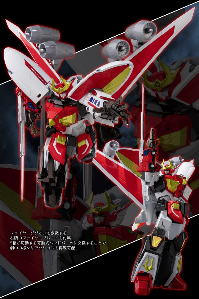 火焰達古王全身施以厚重質感塗裝表現金色部位,多處關節、骨架採用合金材質製作更具重量感,即使是變形合體而成依然維持良好身形比例。包含頭、腰、四肢、機翼、四具噴射渦輪、手掌各關節...等多處皆有靈活可動關節,能夠把玩出極為躍動的姿勢。搭配從雲梯伸出的火焰劍、由劍星人 LIAN 變成的狂獅劍等武裝,能把玩出帥氣的戰鬥姿態!