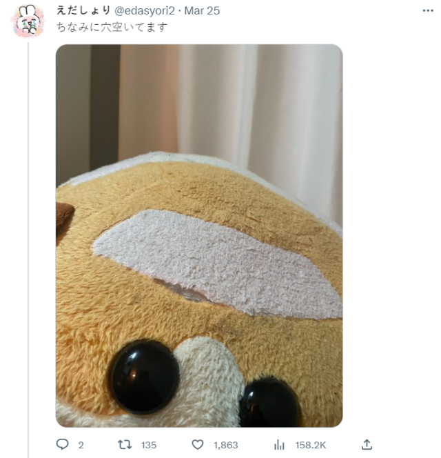 至於為何會這樣呢 ? 推主貼出原來是...破掉了,裡面的棉花都空空了 QQ。不過推主表示是因為拿來當枕頭的關係,可沒有蓄意破壞唷 !