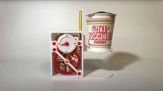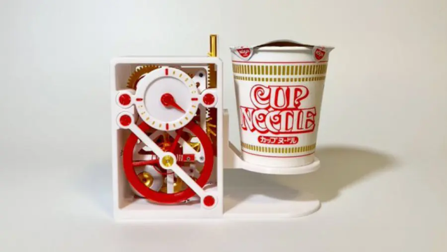 他以日清杯麵的尺寸來設計,只要把杯麵放在旁邊的平台,平台會緩緩下降,配合機械動力原理三分鐘後就會觸底,計時器上面的指針也會跟著作動,還會發出滴答滴答的聲音,讓你更加期待泡麵煮好的美味。