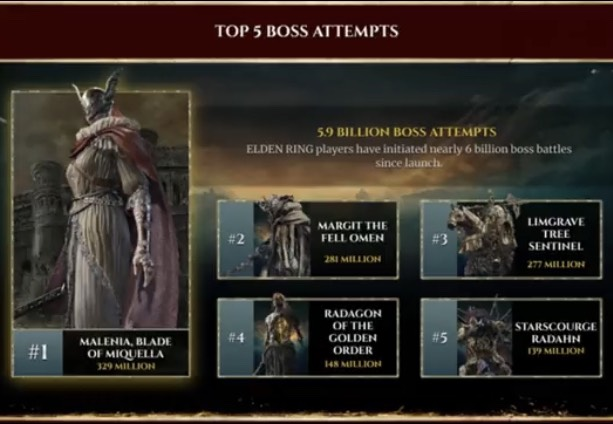 根據統計,全部《艾爾登法環》玩家死亡次數突破 90 億次,挑戰 BOSS 的次數逼近 60 億次,而最多挑戰次數的 BOSS 為女武神蓮妮亞,總共約 3 億 2900 萬次,這些數字也約為遊戲發行一年以來都累積數據。