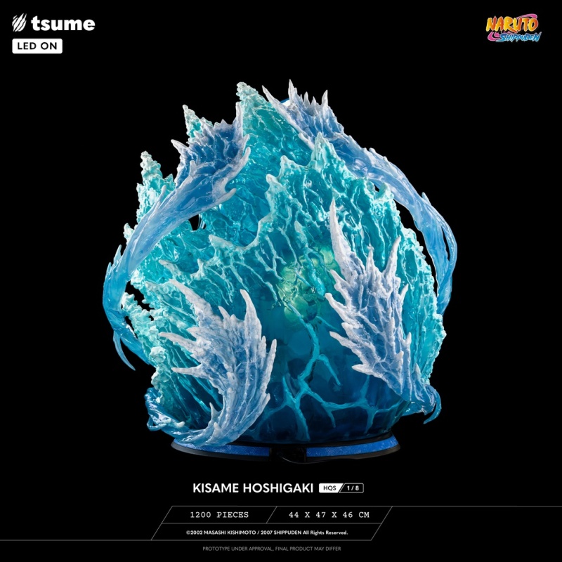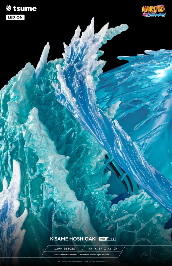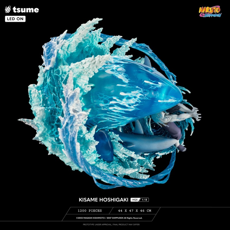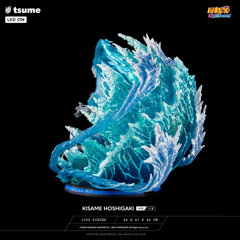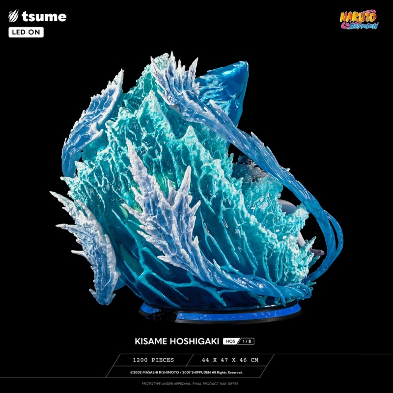 本次 Tsume-Art 的「HQS 干柿鬼鮫」1/8比例場景雕像,以《風影奪還篇》鬼鮫與阿凱老師戰鬥時,使出「水遁‧五食鮫」的精彩瞬間立體化!尺寸全高約 44 公分,深度更是有 47 公分。鬼鮫從五指放出的查克拉化身兇惡的五條鯊魚,在獵物周圍高速排徊產生強烈的激流;生動刻畫出張著利牙大口的鯊魚,背後更是使用透明特效件還原巨大的海之巨鯊!內部置有LED光效,打造氣魄模樣,在籃色透明件中展現出勢不可擋的威力、十足逼真的浪花!