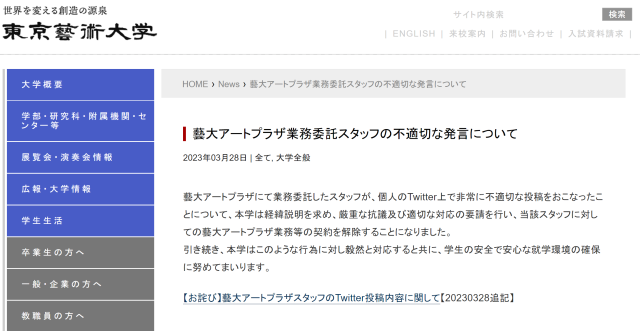 針對這項不當發言,東京藝大也火速在官網上公告,對於該外聘老師在個人推特上的行為,受到廣大網民抨擊且要求適當處理下,決定開除該師,也希望社會大眾對於東京藝大的學生安全保持信心,校方會努力維護學生的就學環境。