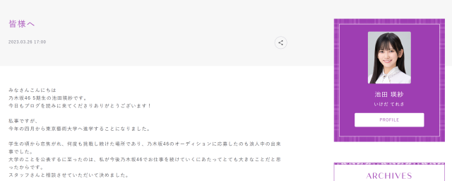 日本人氣女子偶像團體「乃木坂46」成員-池田瑛紗,於日前在部落格上宣布自己成功考入了藝術學府「東京藝術大學」,本是應該受到鼓勵與加油的事情。卻意外在推特上出現了該校教職員發文對該新聞表示 : 「該是濫用職權的時候了」,被網民起底,東京藝大也火速提出聲明表示開除該外聘教師,快速的處理也受到粉絲與網友讚聲。