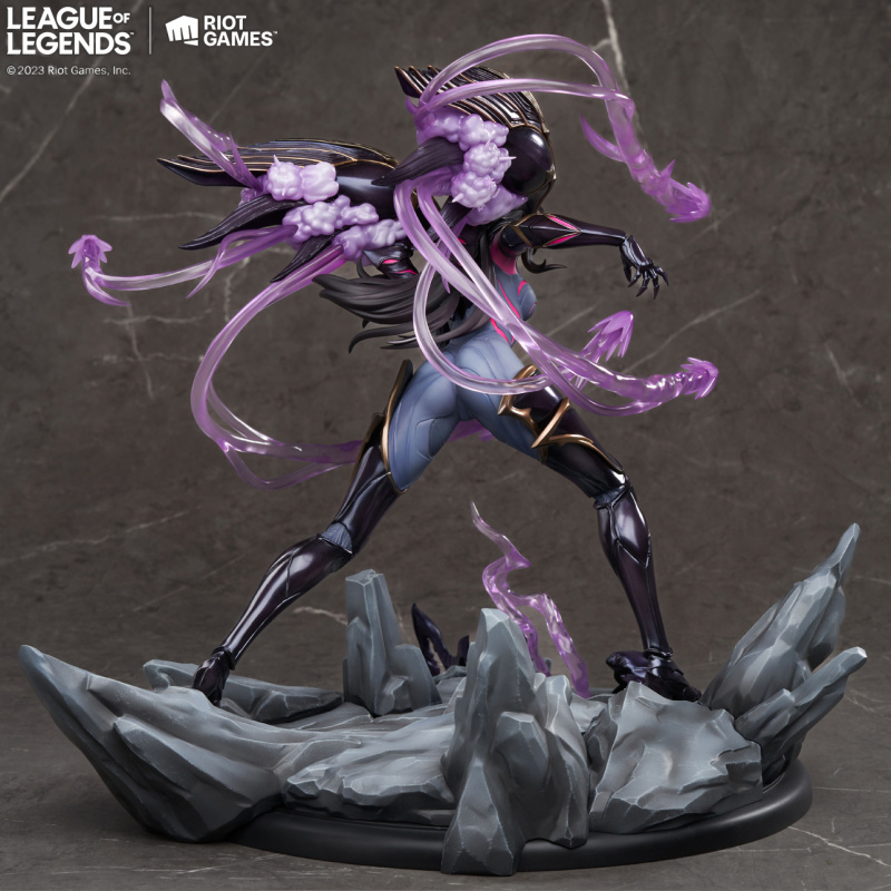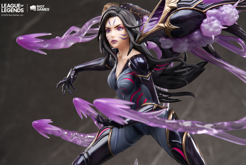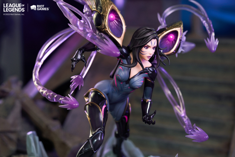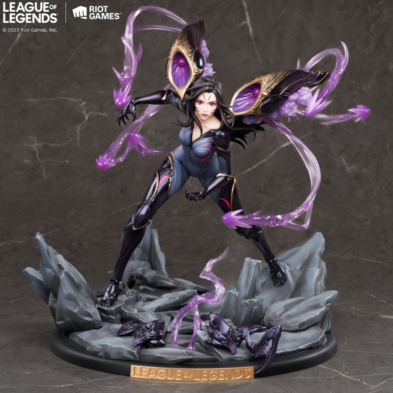 作為一個定位特殊的 AD,能利用標記瞬間縮短與敵方角色的距離、並快速狩獵對手的「凱莎」一直是許多玩家的愛用角色之一;本作即是以凱莎正在施放招牌技能「伊卡西亞魔雨 (Icathian Rain) 」為題設計,高度來到 30 公分,再現了全身覆蓋著蟲甲的凱莎本體與發射出來的導彈特效,凱莎纖細但凹凸有致的身形線條形塑、黑色長髮的飛舞動感,以及導彈發射的煙霧......等皆施以細緻刻畫,兩側莢囊與盔甲更以金屬感、珠光色澤的塗裝表現逼真生物感,搭配位於莢囊、底座的發光功能,點亮之後更具激戰臨場感。