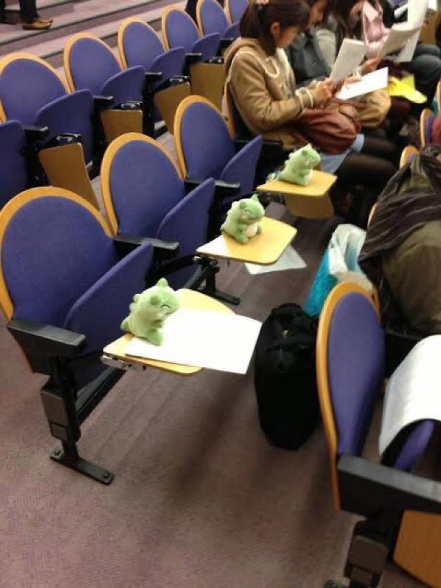 喔不不,我不是說寶可夢對戰,我指的是...對,像是請替身娃娃代替上班上課之類的情況。專門分享有趣圖文的Twitter帳號草ッターwwwww(@kusatta_www),就曬出了一張三隻寶可夢「替身娃娃」,擺放在三張缺席的座位上,明顯意味著今天沒有到課的三位同學,使用「替身」來接受講課老師的攻擊XD