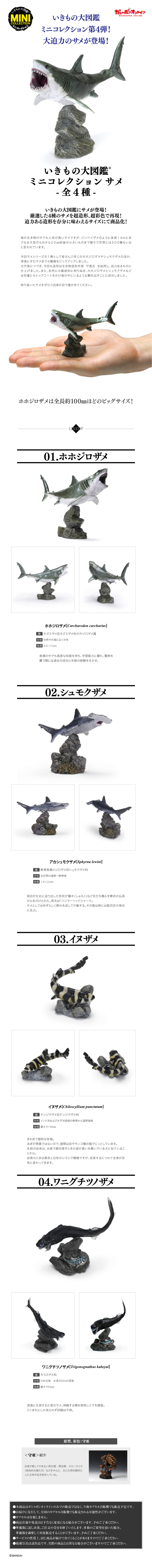 第四彈的「生物大圖鑑 迷你收藏鯊魚」轉蛋,有別於先前超過 10 公分的大份量、多可動關節賣點,採用 40-100 mm 不可動模型製作,生動還原生物在自然界中的姿態與造型。本彈以鯊魚作為主題,收錄有大白鯊、雙髻鯊、條紋斑竹鯊、卡氏尖頜烏鯊四種人氣鯊鯊,並完整重現身體比例,包含特色的紋路、在水中光滑的質感等生物細節。