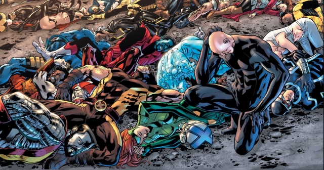 首先,在由Bryan Hitch繪製的這張宣傳圖中,我們可以看到X教授哀悼著整群倒在地上的X戰警們,這幅畫面也致敬了80年代故事《變種人之殞落》(Fall of the Mutants)的經典封面。