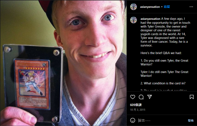 一直到今天,成功戰勝病魔,並且現年已經32歲的Tyler Gressle,便決定賣出這張意義非凡,且獨一無二的珍貴卡片。