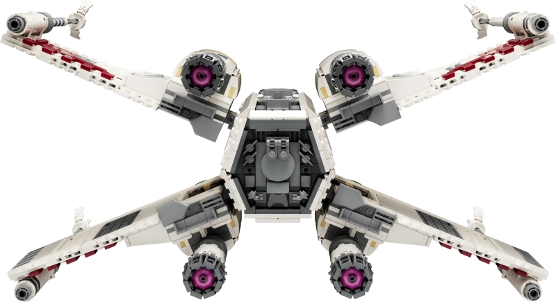 本作一共有 1949 片零件,組裝完成之後長度來到 55 公分,從零件數與完成尺寸這兩點來看都是目前最大級的 X翼!色彩部分再現了白色主調與灰色、米色、酒紅色的點綴,除了可以將駕駛艙蓋掀開、放入路克·天行者人偶並欣賞儀表板細節之外,也能將好夥伴 R2-D2 安置於後方的空間,從背面可以看到的噴射引擎結構更是相當迷人,另外,還可以藉由轉動 X翼戰機頂部的圓形科技零件來控制機翼的角度喔!搭配附有資訊版的黑色展示底座,整體實在是有夠帥。