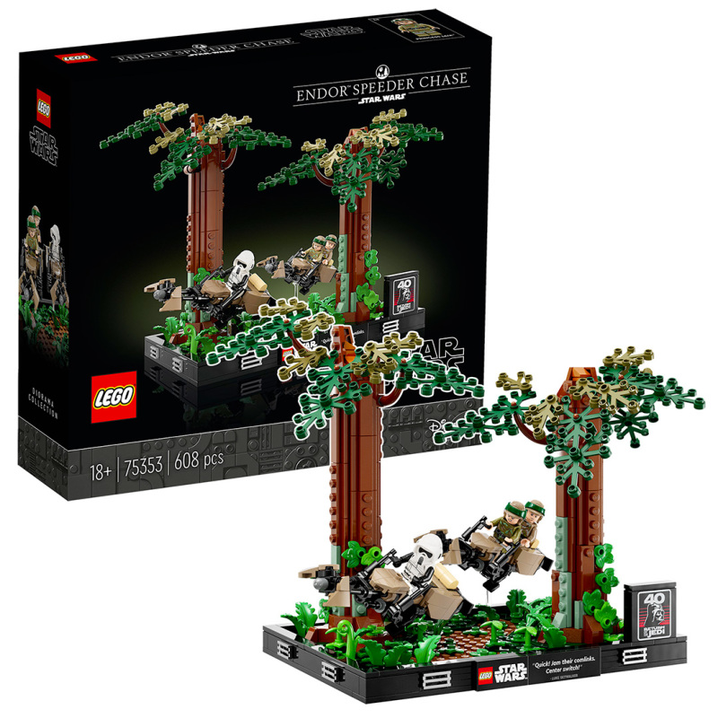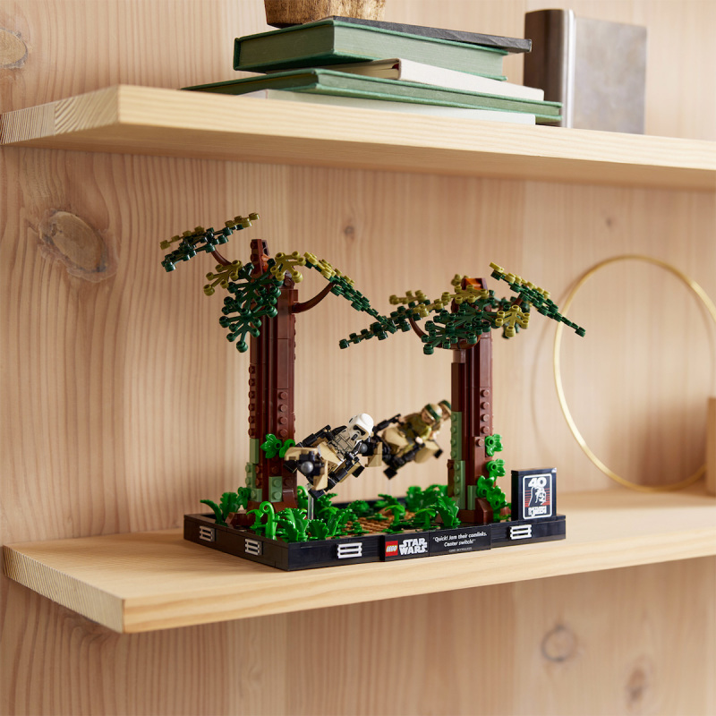 本作一共有 608 片零件,以兩棵磚拼大樹、豐富的綠色植物零件來重現恩多星球著名的樹海場景,並採用透明長條零件作為支架,讓騎著反重力機車(Speeder Bike)的路克&莉亞、帝國偵察兵更有漂浮半空、正處於飛車追逐的緊張感,一次可以獲得兩台反重力機車跟帥氣的偵察兵,以及身穿迷彩野戰服裝的路克、莉亞人偶超級划算!慶祝《絕地大反攻》四十週年的 LOGO 零件與「皇帝的王座室」同樣放在右邊的位置。