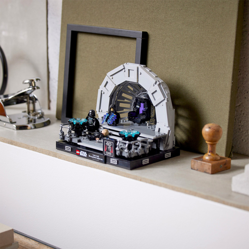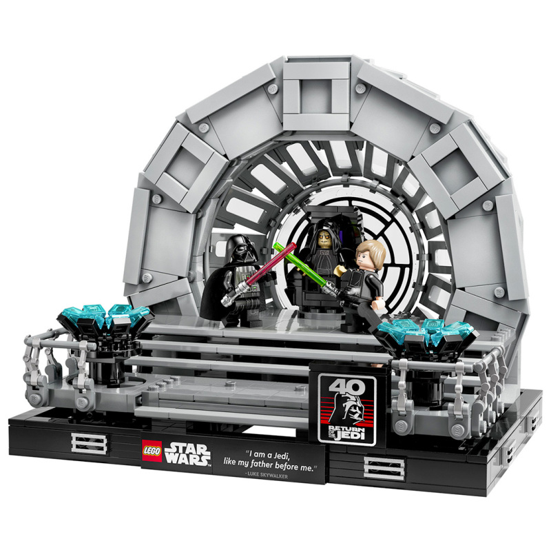 本作利用 807 片零件構築出星戰經典三部曲的最高潮-「路克·天行者」與「達斯·維達」面對面的最終決戰,而銀河帝國的皇帝「達斯·西帝」則坐在他的王座上欣賞著這場決定銀河系命運的父子大戰。整體來說可視為是早先 75093、75291 這兩款「死星最終對決」的精華濃縮版,保留了路克、黑武士、皇帝這三位重點角色,且在王座後方半圓頂空間更具份量感,堆砌方式令人相當期待!經過修飾的顆粒感也讓這款場景更具大人味,加上印有路克台詞的名牌、印有《絕地大反攻》四十週年 LOGO 的零件,展示起來超棒!