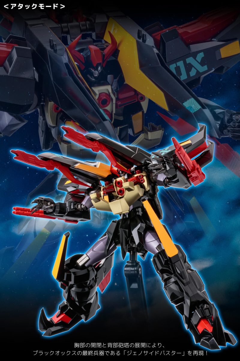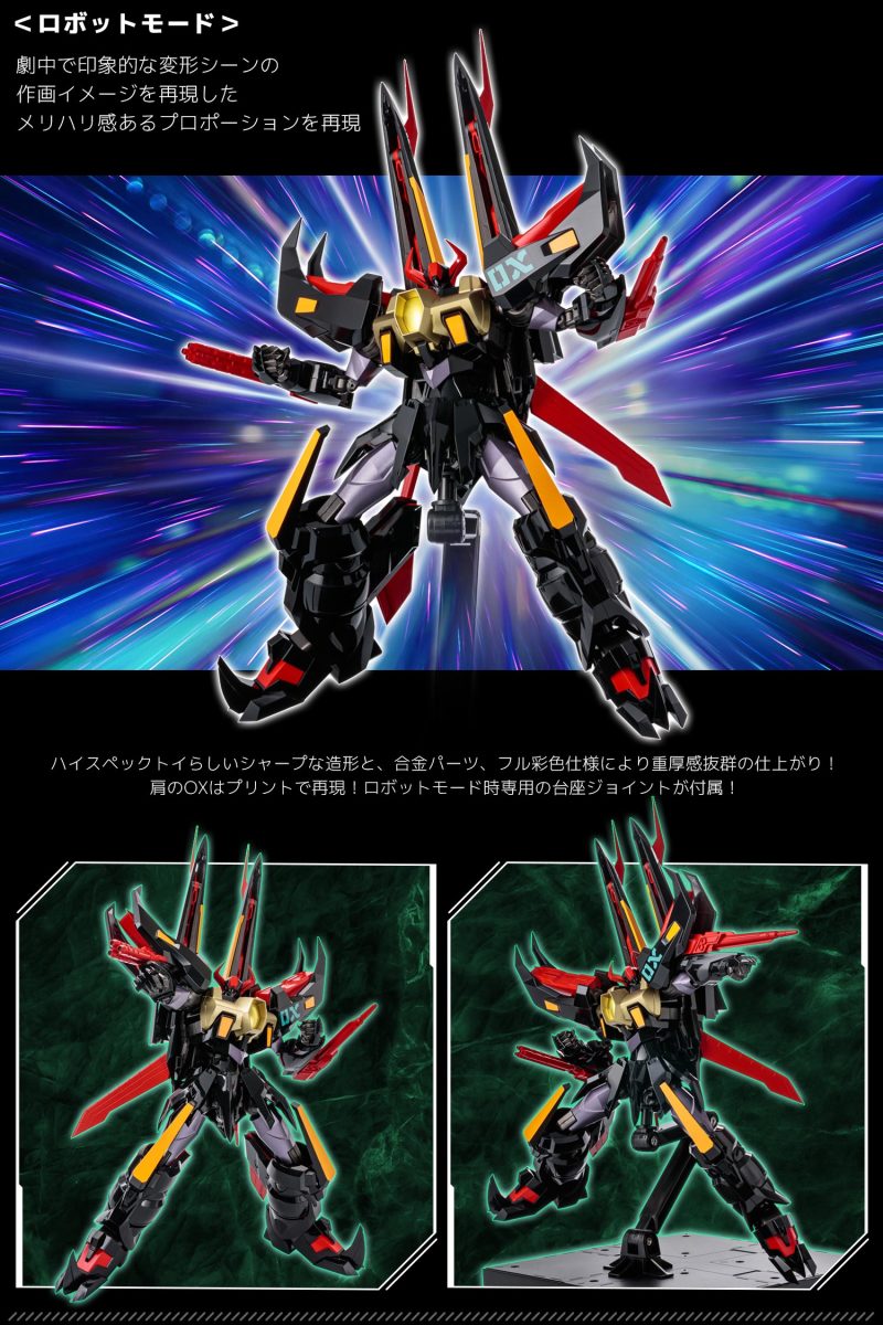 「RIOBOT 黑牛」以現代風格與最新技術重新詮釋造型,擁有 29 公分高魄力尺寸,兼具銳利裝甲與帥氣的高頭身比例,並融入彷彿壯碩肌肉的線條。整體塗裝施以金、銀、紅、黑等呈現厚重質感的色彩,部分部位更採用合金材質零件製作,不論是視覺上或實際把玩起來都富有重量感。此外透過另售的黑光燈照射頭部與胸部就能產生發光效果。