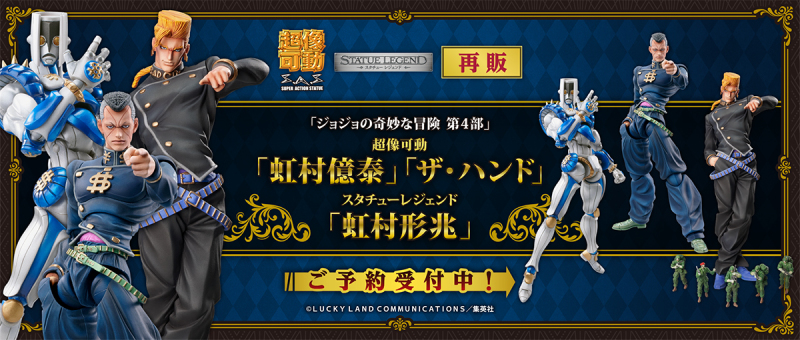 由日本 Medicos 玩具公司發行、Di molto bene 製作的「雕像傳說系列」,將再販推出以《JOJO的奇妙冒險 第四部 不滅鑽石》為主題的商品:「雕像傳說 虹村形兆&極惡中隊」,另外也將同步販售與「超像可動 虹村億泰、轟炸空間」的三體套組!參考售價為 26,400 日圓,預計將於 2023 年 12 月發售。