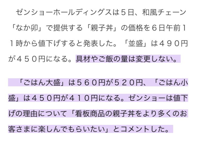 但在日本的丼飯連鎖餐廳-なか卯,卻在昨日 ( 4/6 ) 宣布了將調降「親子丼」的價格,從原本的 490 日圓降至 450 日圓,雖說僅下降一點點的價錢,但這樣逆向操作的方式也著實讓日本消費者感到驚訝,也吸引不少人在這兩日前去用餐。