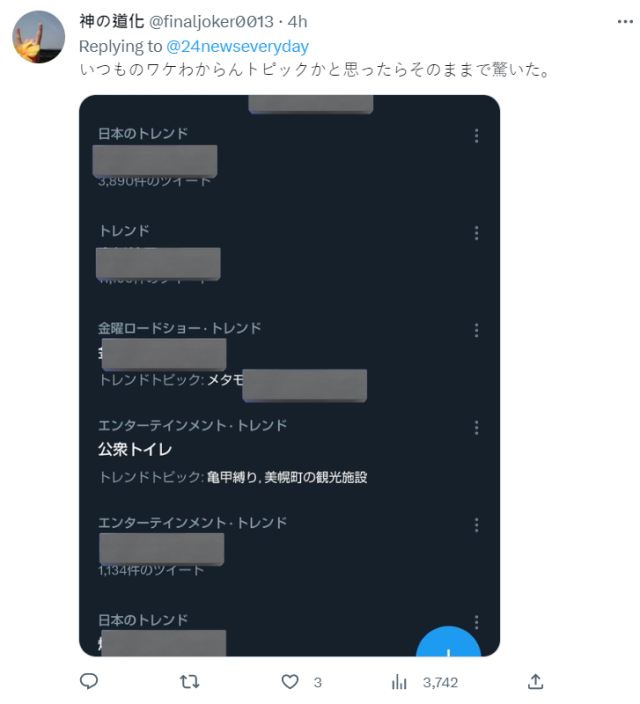 如此離奇的新聞成為網民話題之外,連「公共廁所」也成為了推特趨勢...。