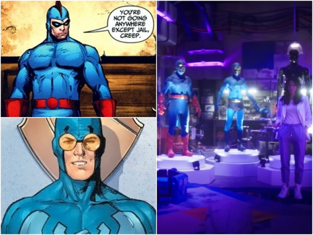 在珍妮的秘密基地裡,可以看到兩套藍甲蟲的戰服,是參考第一、二代藍甲蟲的造型。