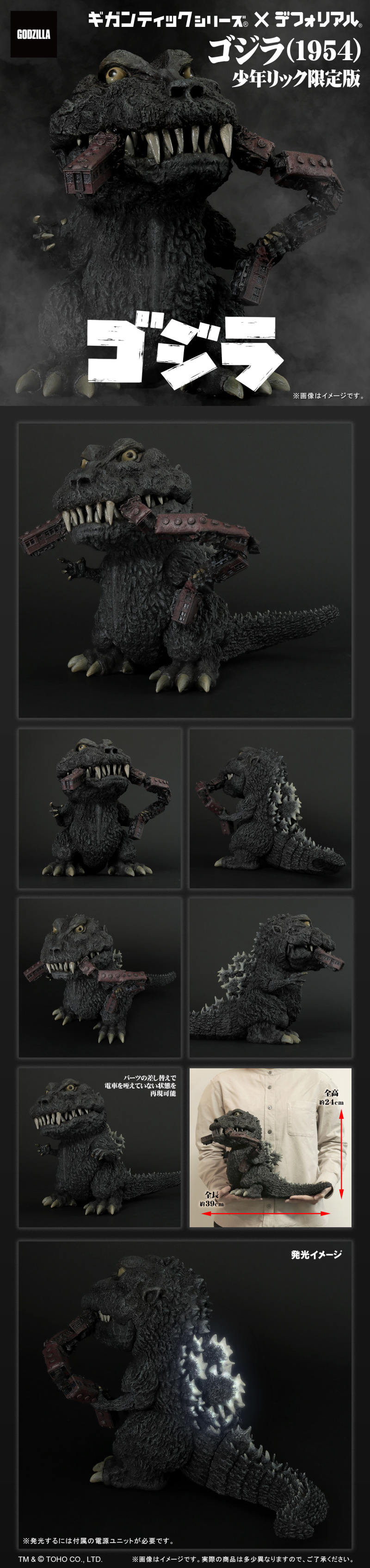 「GIGANTIC × DEFOREAL 哥吉拉 (1954)」,結合 GIGANTIC 的巨大尺寸與 DEFOREAL 的Q版擬真造型,將原本約 13 公分的 DEFOREAL初代哥吉拉 放大到高 24 公分、長 39 公分的份量等級!採用新規造型重現哥吉拉在劇中經典的咬著電車場景,圓圓的眼睛與尖銳的利牙驚悚駭人,在利爪、背鰭、皮膚等細節的塗裝也擁有逼真的精細度,但整體卻帶有可愛趣味感!
