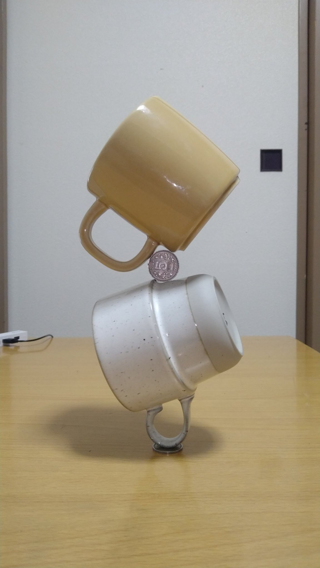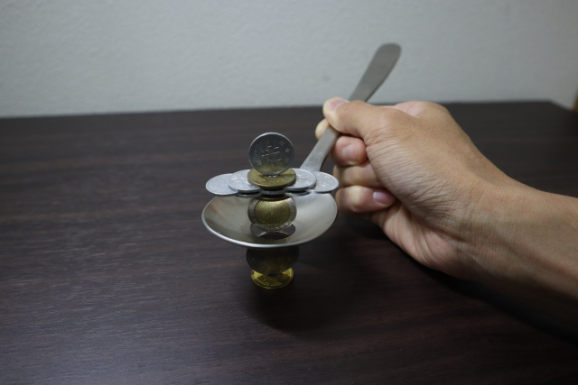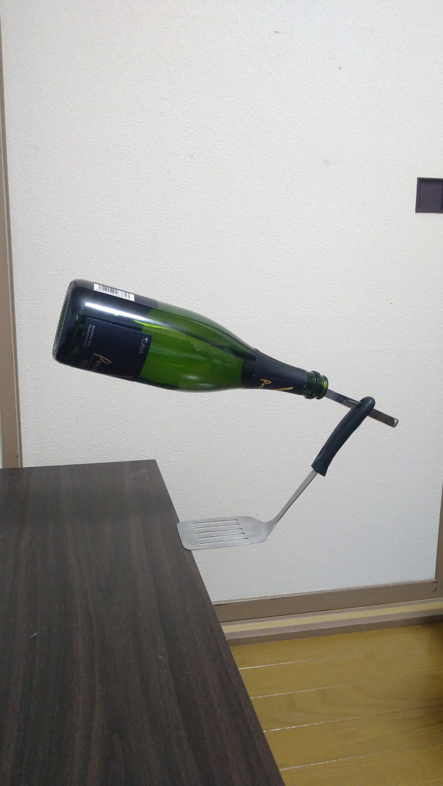 日本一名推主「た ぬ」(@thumb_tani)利用家中一些常見的物品來「堆疊」並且達成很微妙的平衡,像剛開始看到的圖,餐刀插在酒瓶裡然後握把又插在鍋鏟握把的洞上,而鍋鏟又很微妙地立在桌子的邊緣。