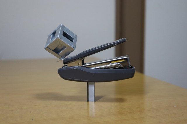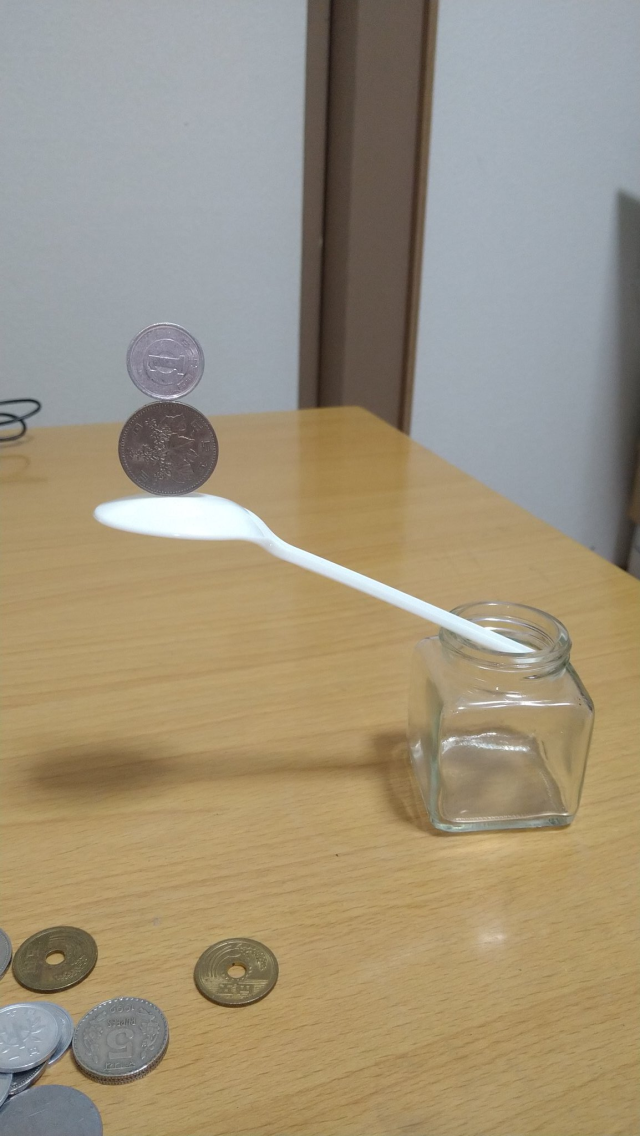 再來,榔頭的頭直立在湯匙柄上,而鑷子的握柄則插在湯匙的洞上,鑷子尖端則立在桌子邊緣,又是一個「危險」的平衡。