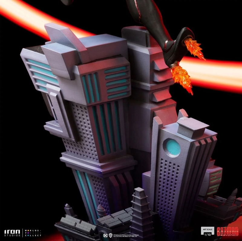 本次以 29 公分立體化的「Art Scale 未來蝙蝠俠」呈現出泰瑞展開雙翼、左腳推進器噴出火焰,似乎是在滑翔中緊急煞車的姿態,黑紅配色的蝙蝠裝形塑出深刻的肌肉線條,並將位於胸口的蝙蝠標誌、遍佈全身的紅色紋路、銀色的腰帶......等造型特色充分還原,採用特殊彎曲角度所打造的未來大都會 Neo-Gotham 場景底座也是非常吸引人的一環!