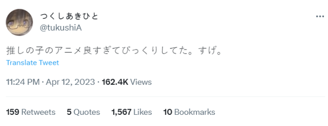 連《來自深淵》的作者土筆章人 (つくしあきひと) 也在推特上發文,表示《我推的孩子》動畫真的很棒又讓人驚訝。( 小編私以為他應該是愛胃痛的部分 XD )