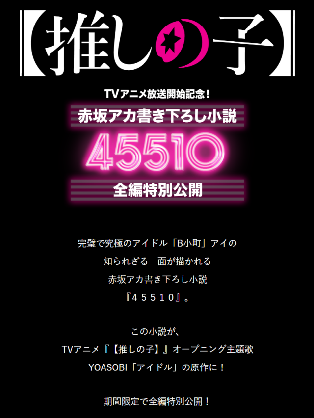 當然擅長將小說歌曲化的 YOASOBI,這次歌曲「IDOL」也同步公開音樂原版小說「45510」 ,由漫畫原作赤坂明編寫,目前也已期間限定公開。( 點我去看原版小說 )