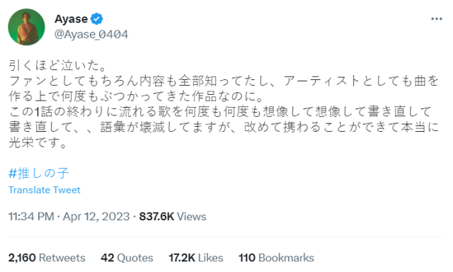 YOASOBI 的 Ayase 也在動畫播出後發推表示自己看到流淚,在創作歌曲時多次面對的作品,一遍又一遍地想像這一集結尾播放的那首歌想像它、重寫它,我真的很榮幸能夠再次參與其中。