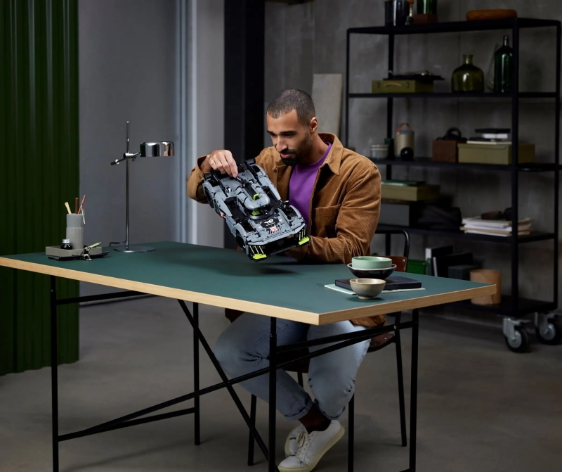 這次樂高的「Peugeot 9X8 超級賽車」總共利用 1775 片零件構成,採用 1/10 的比例製作,長度來到極具存在感的 50 公分,高度則是 13 公分,整體依照 Peugeot 9X8 實車的黑灰色為主調,並在駕駛座頂部、前保桿位置點綴搶眼的螢光綠,頗具未來感,也能在各處看到 Peugeot、93、米其林必比登、道達爾(TotalEnergies)的貼紙,Peugeot(寶獅)的 LOGO 真的超帥!極低的底盤、符合空氣力學的車型、堪稱招牌的獅爪元素,相當大膽的鯊魚鰭定風翼......等特色也有不錯的還原度。