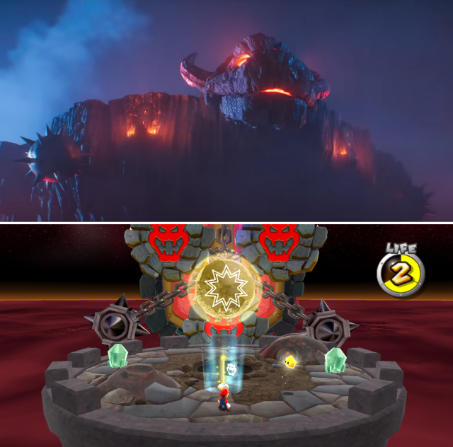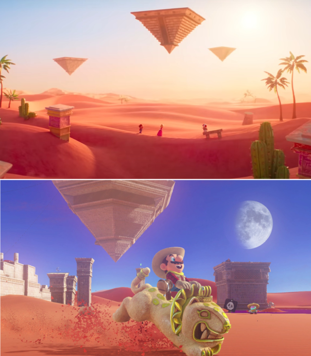 瑪利歐一行人途經多個國度。其中他們經過了空中有倒金字塔的「沙之國」,這是出自2017年發行於任天堂Switch 的《超級瑪利歐:奧德賽》。