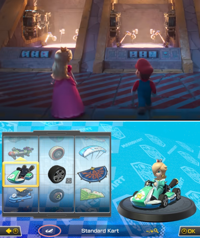 眾人在金剛王國打造自己的改裝車上路,這一段是取自2014年在Wii U、2017年在任天堂Switch所發行的《瑪利歐賽車8》,就連安裝介面、音效都直接複製遊戲。