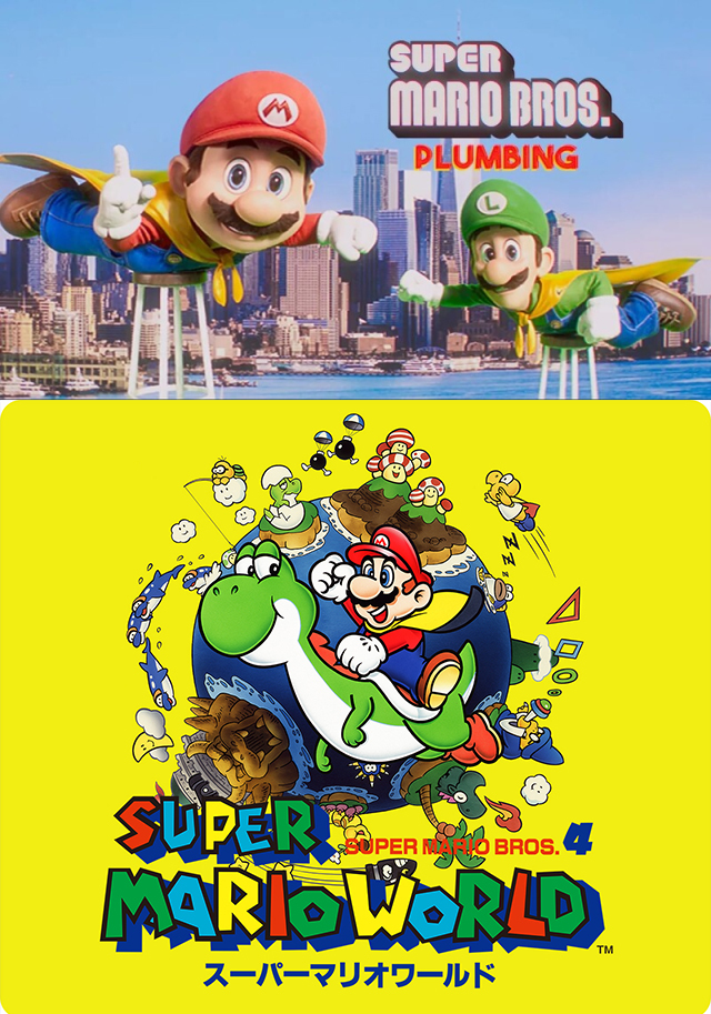 回到人類世界,瑪利歐兄弟在一家披薩店裡,得意地看著他們拍攝的廣告,廣告中他們披著披風,是參考1990年於超級任天堂上發行、被俗稱為「超級瑪利歐兄弟4」的《超級瑪利歐世界》造型。