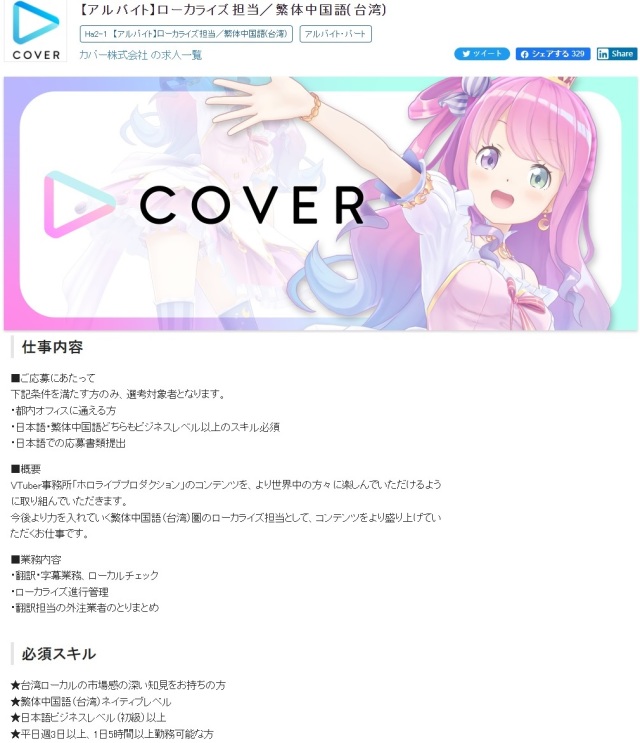 無獨有偶,日本另一家龍頭 Vtuber 經紀公司 Hololive 母公司 Cover 近期也開出了招募台灣在地化人員的打工職缺,人才必備條件需要繁體中文母語等級、日文商務等級,但時薪也僅有 1100 日幣,消息一出後也一樣受到不少台灣網友的嘲諷,直指「拿香蕉請人?」、「東京洗盤子都比這高了」、「上市公司給的那麼小氣」,但也有網友護航「歡喜做甘願受」、「不缺錢,去拼個一年看有沒有轉正也不錯」