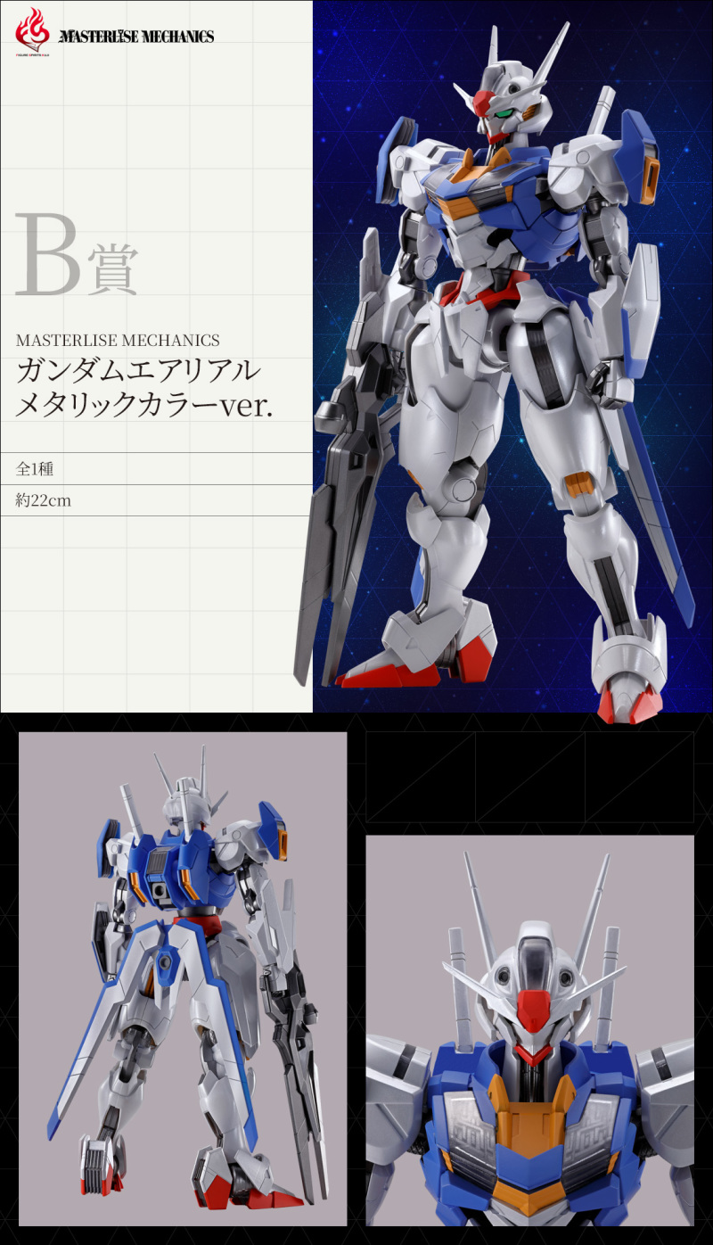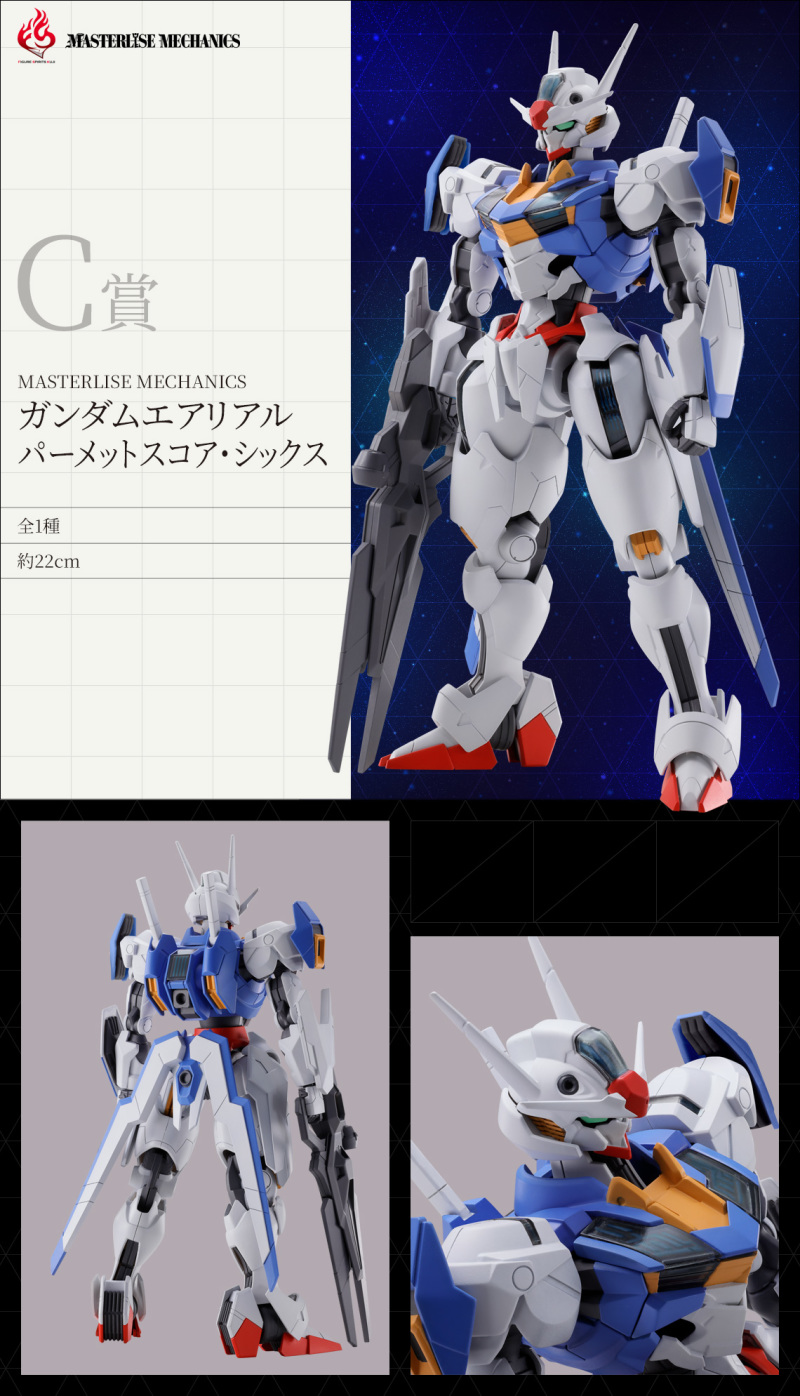 『機動戰士鋼彈 水星的魔女 風靈鋼彈』的 A~C 賞皆為全高 22 公分高的「MASTERLISE MECHANICS 風靈鋼彈」不可動完成品模型,製作出極具銳利感的裝甲邊緣、高密度的細節表現,裝甲的層次、佈線、標誌設計都是滿滿看點,再現了風靈鋼彈運用幾何構成的裝甲與優美曲線。