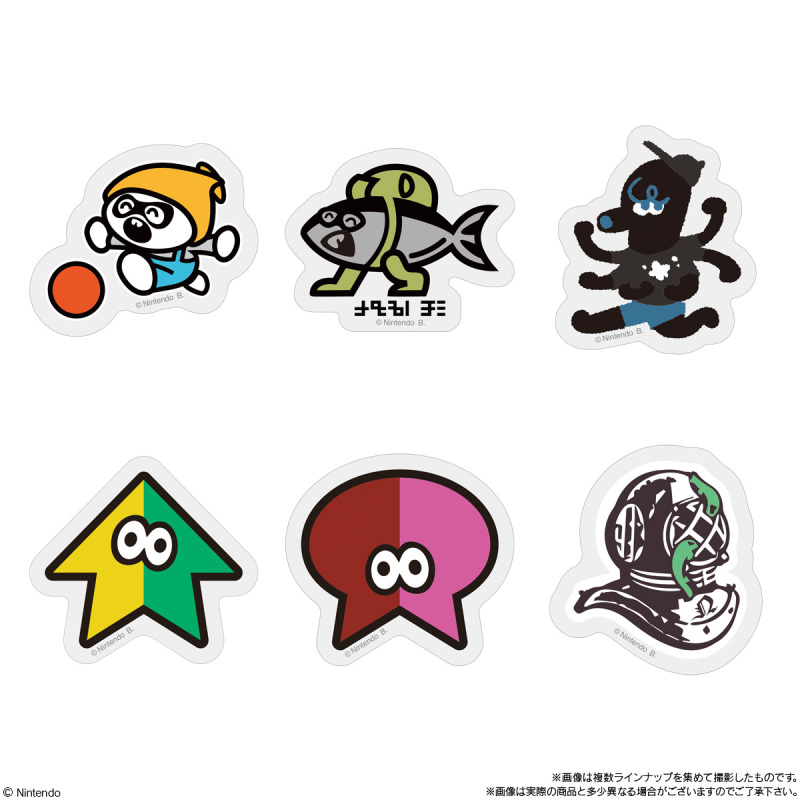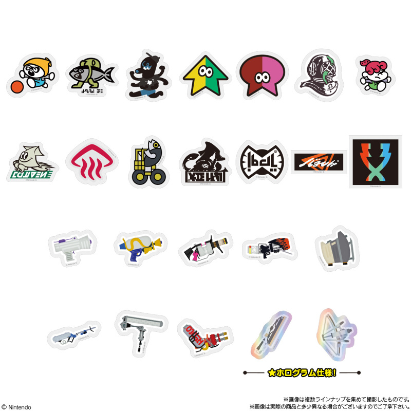 BANDAI CANDY 所發行的「斯普拉遁3 貼紙月輪零食」則是一款讓玩具人能在現實中享受到跟遊戲裡一樣佈置快感的商品,主打和遊戲裡一模一樣的貼紙造型、收集越多就能越豐富為賣點,每一包裡頭共有一張貼紙+海鮮味(シーフード味)的餅乾(10 克),全部有 24 種款式,除了豐富的角色、標誌之外,各式武器也很吸引人,像是電動馬達滾筒、迴旋潑桶、斯普拉射擊槍,以及全像投影樣式的三發獵魚弓、與刷刮水刀!與同是 BANDAI CANDY 推出的「斯普拉遁3 武器收藏」搭配更讚。