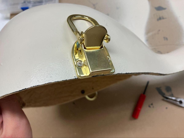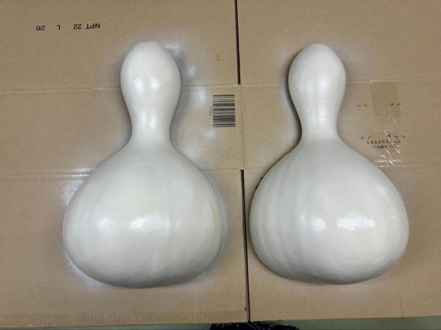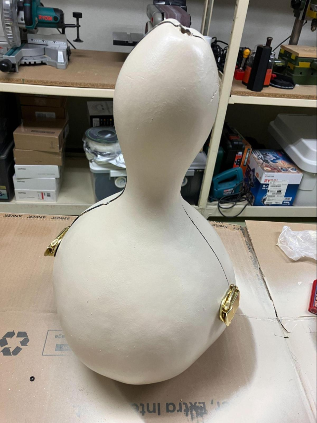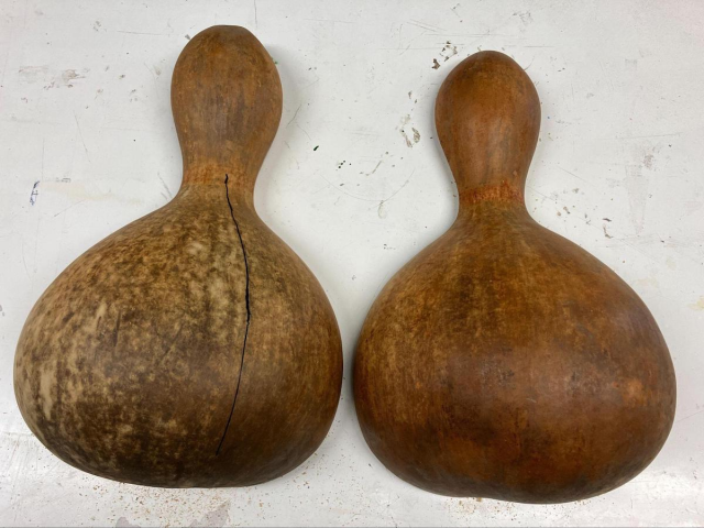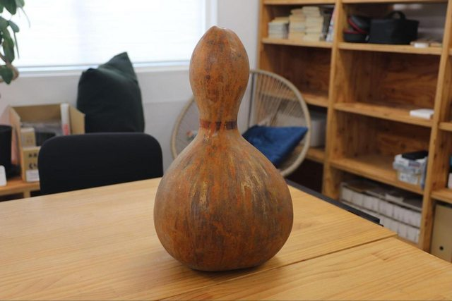 要製作一個葫蘆創作並不容易,她選擇用真正的葫蘆來製作,將其分切成兩半,以方便後續創作利用。