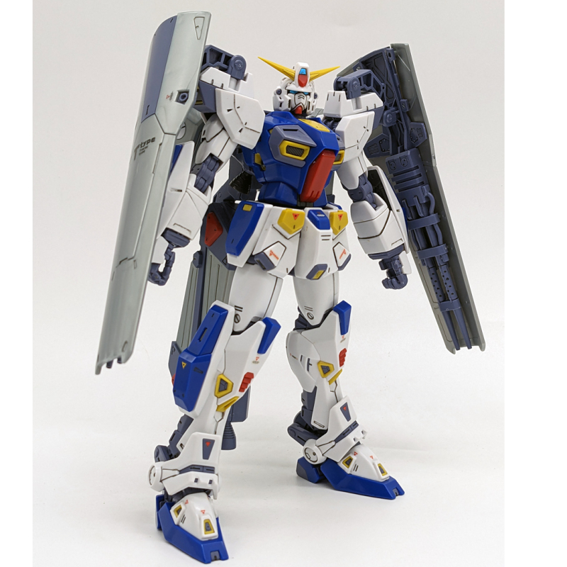 兩邊的大型盾牌(內藏兩支大火力光束槍)和推進器背包為本裝備的一大特色
