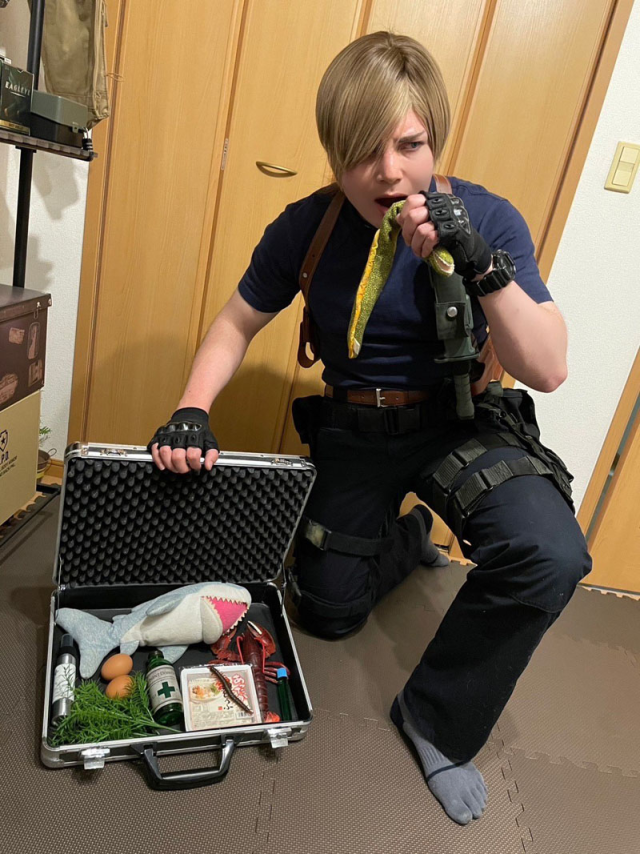Cosplayer的てきさす(@texas_uss)為了驗證《惡靈古堡4/RE:4》中里昂的公事包到底怎麼裝東西的,他總之先照著自己遊戲畫面中道具欄的排列來排道具,有槍、藥草、食物、刀、口糧等,等排完之後,再放個里昂...其實是他朋友アレキサンダー(@Sasha_cosplay)躺在道具旁邊,公事包塞的東西排起來長度大概跟里昂身高差不多,遊戲裡他到底怎麼塞的!?