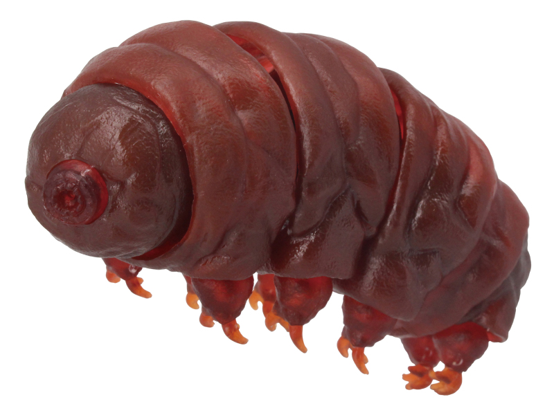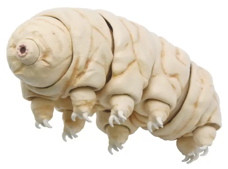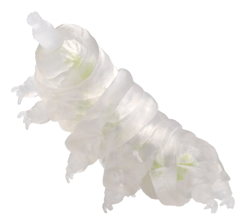 被稱為地表最強生物的「水熊蟲」,是體長僅約 0.3-0.5mm 的多細胞微小生物,歸類於緩步動物門。具有四種隱生狀態–低濕隱生、低溫隱生、變滲隱生跟缺氧隱生,在各種艱難的條件下都可以存活,甚至在高輻射劑量的太空中也能生存。擁有頭部和四個體節、八隻帶有抓子與吸盤的腳腳,身形圓潤飽滿。在極端情況下牠們會捲縮起來並停止代謝,進入「假死」狀態,等待適當的時機再次復活。